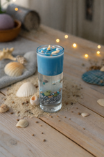 Dit decoratieve waxobject is met de hand gegoten in een lang glas en afgewerkt met gelwax en soyawax, geïnspireerd op de zee. De combinatie van schelpen, parels en subtiele glitter zorgt voor een luxe en zomerse uitstraling.